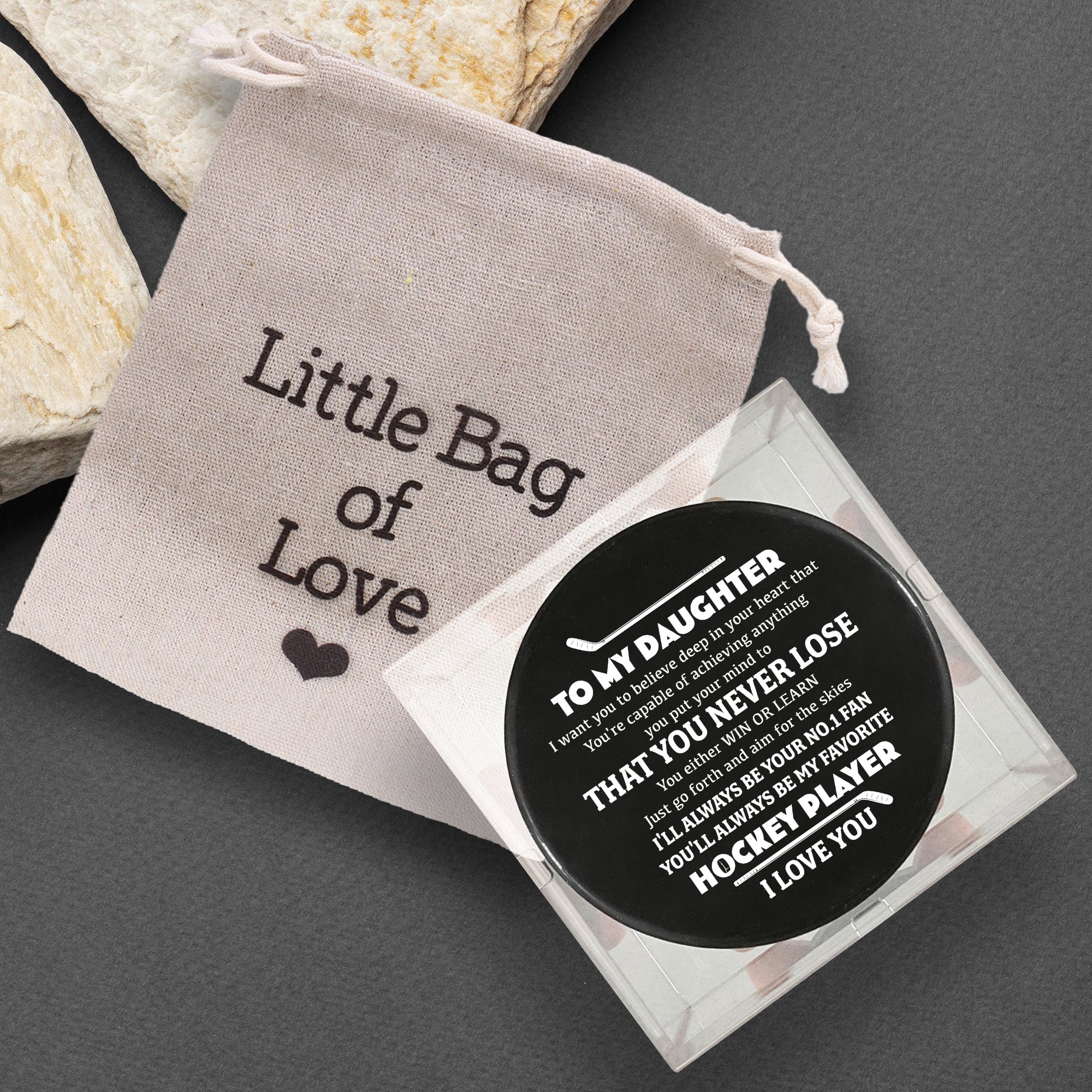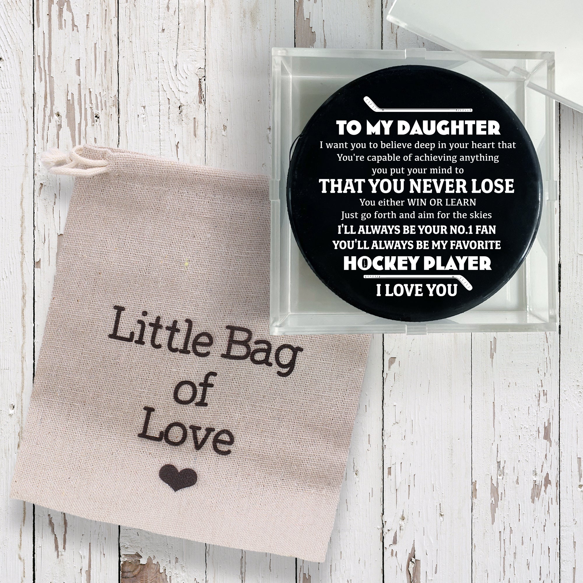 We also make an offer option to make your gift for your daughter perfect and unique. The puck can also come with a box to make your gift shine and more special.