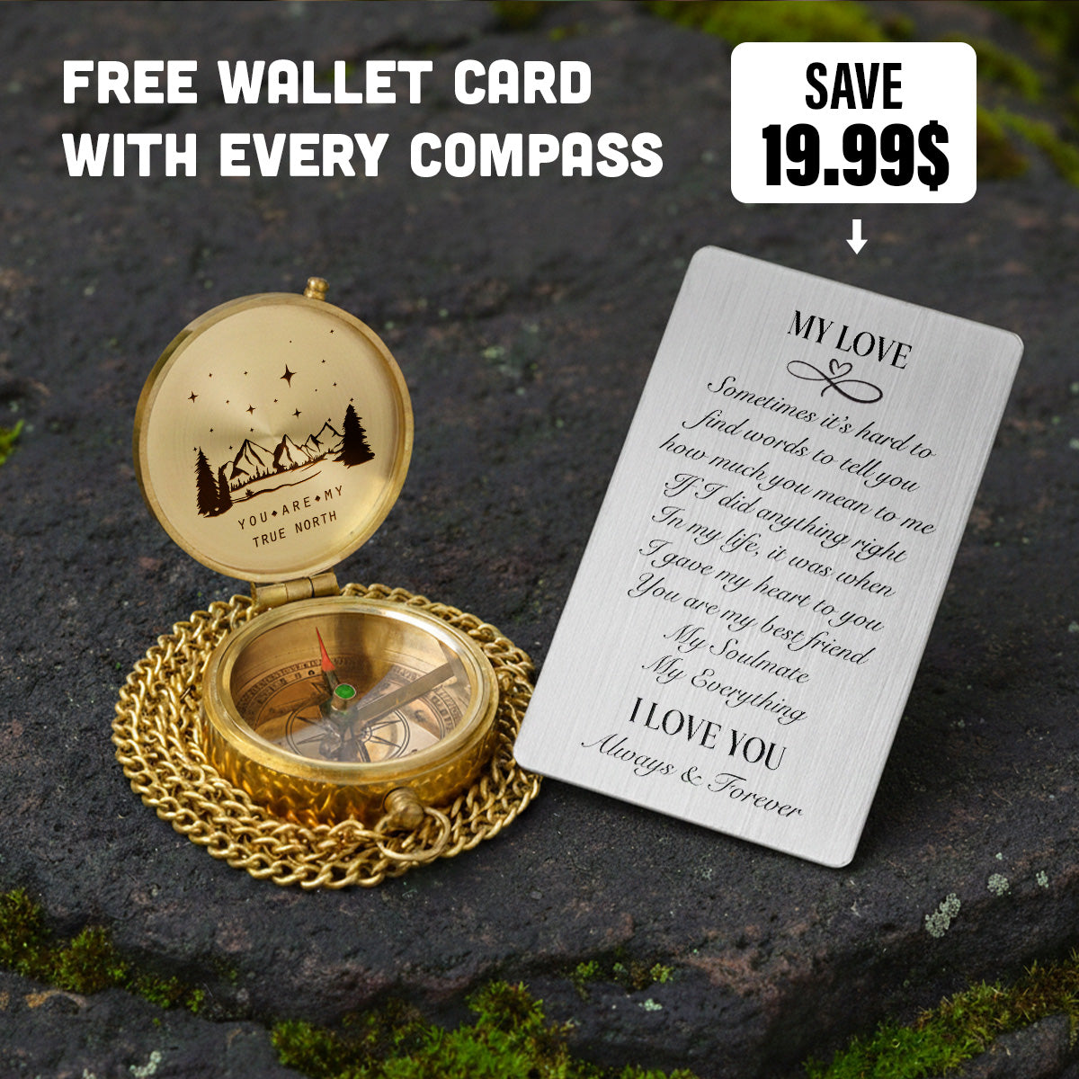 The compass represents direction, trust, and shared paths. The engraved wallet card carries the message they’ll read again and again - right from their pocket.